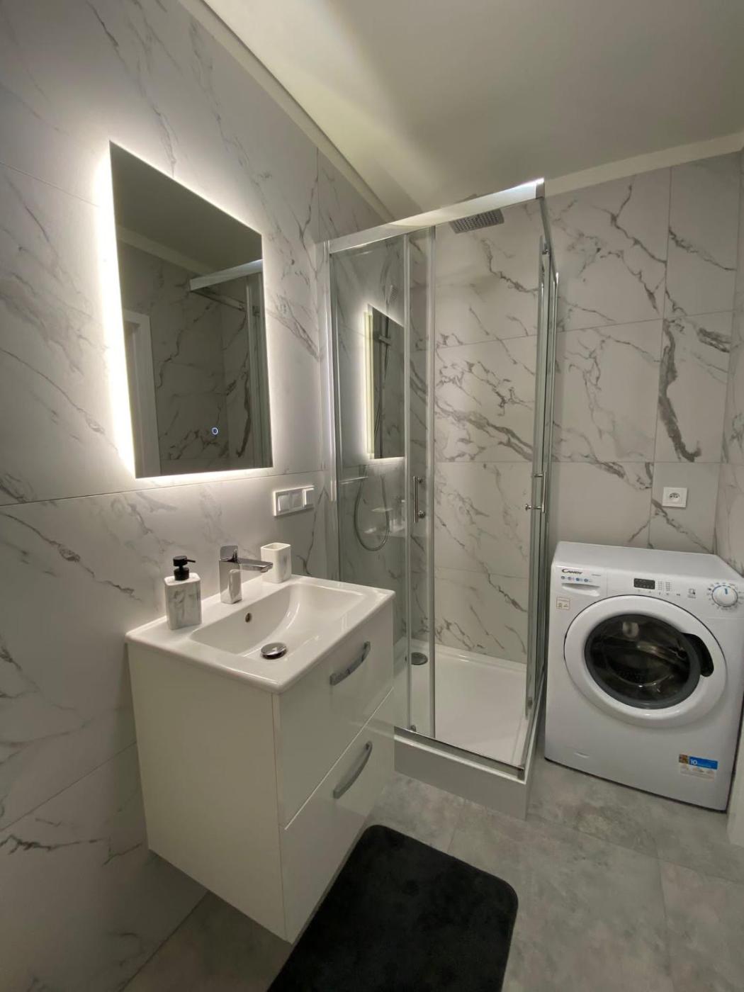 Apartament z 1 sypialnią. This apartment is comprised of 1 living room, 1 separate bedroom and 1 bathroom with a shower and a hairdryer. Guests can make meals in the kitchen that is fitted with a stovetop, a refrigerator, a dishwasher and kitchenware. The apartment offers a washing machine, a tea and coffee maker, a wardrobe, a sofa and a flat-screen TV with cable channels. The unit offers 2 beds. Apartament - 7 osobowy. Powierzchnia pokoju ok.: 43 mkw.